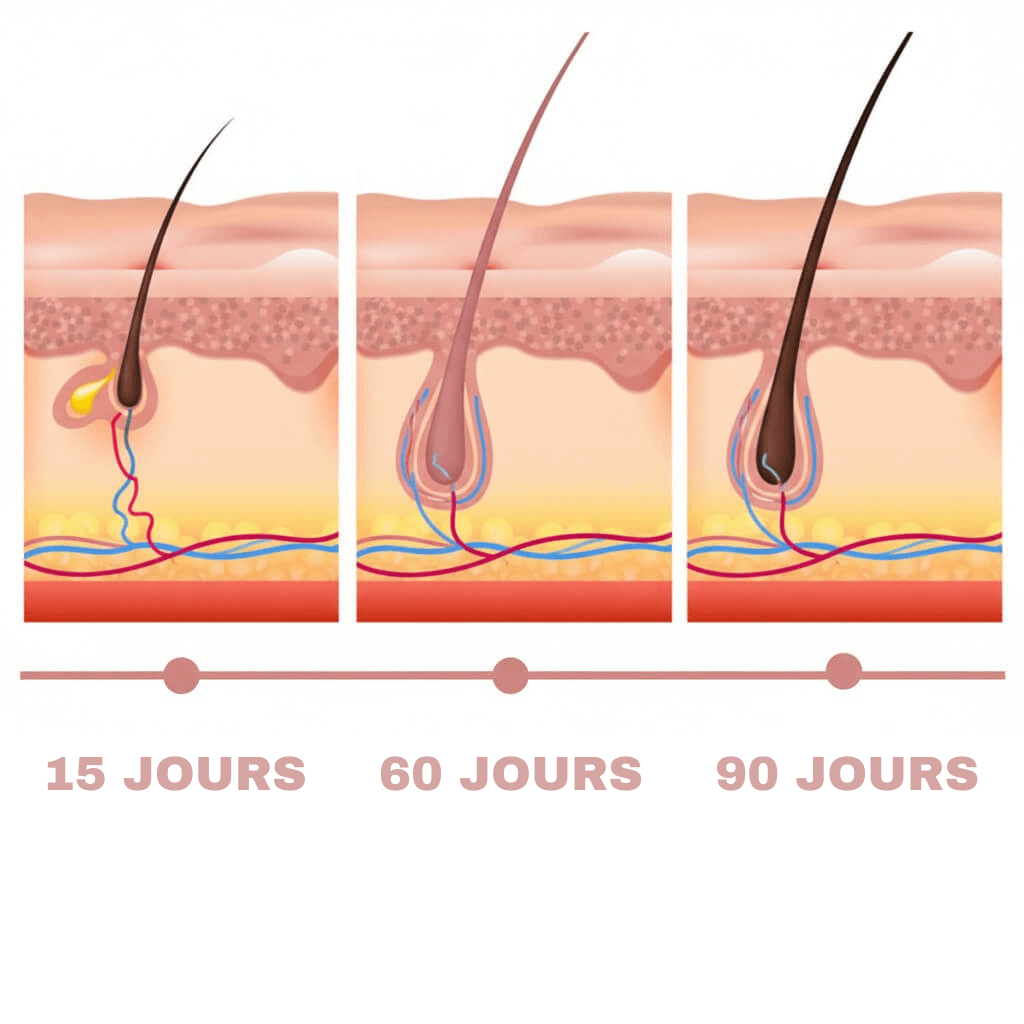 Les premiers effets apparaissent souvent dès 15 jours (réduction de la perte). La repousse devient visible entre 30 et 90 jours.