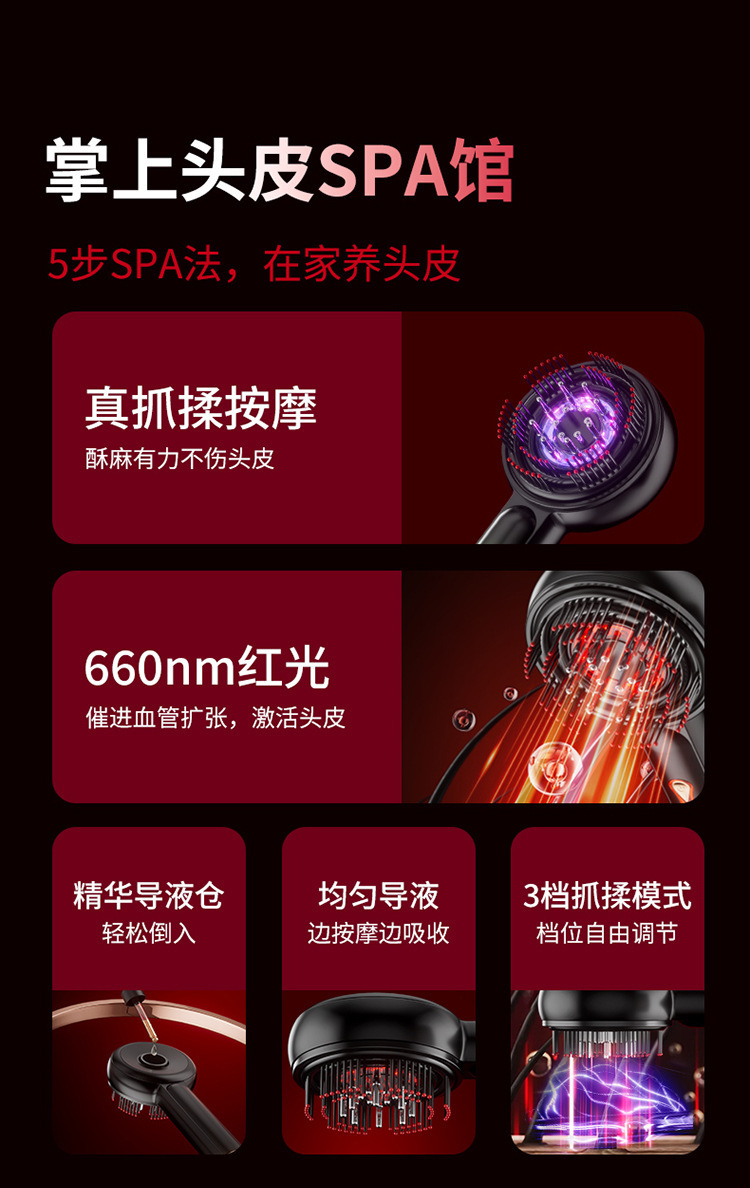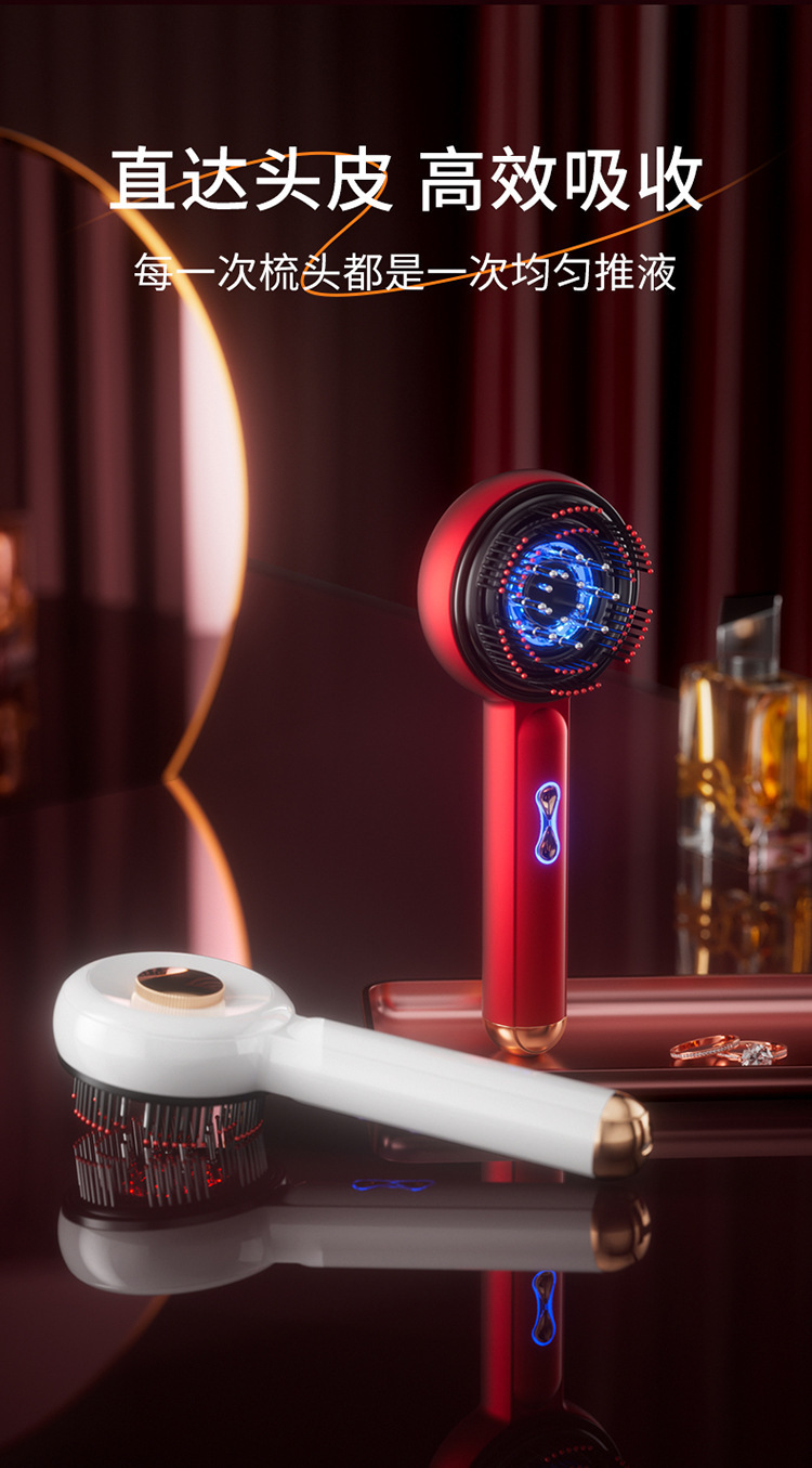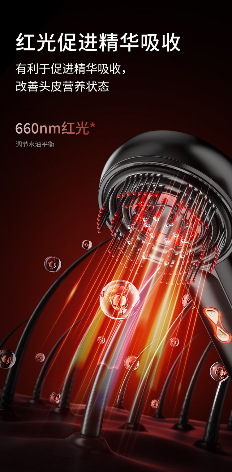 La lumière rouge stimule la microcirculation, les picots massants libèrent les tensions, et vos soins sont diffusés directement à la racine pour une efficacité optimale.