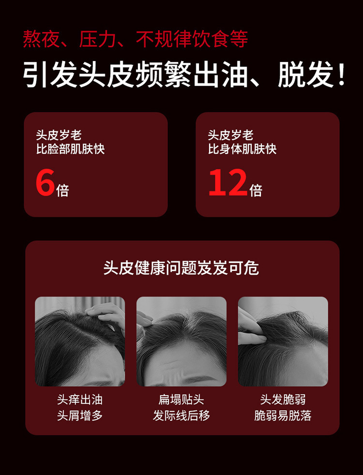 Le massage combiné aux micro-courants EMS et à la lumière rouge active la microcirculation, oxygène les follicules et renforce les racines pour favoriser une croissance plus dense et réduire la chute des cheveux.